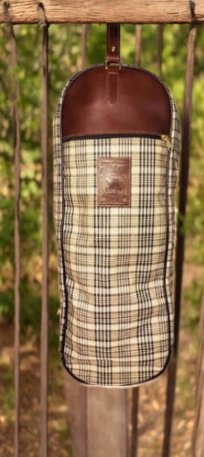 The 5/A Baker® Bridle Bag is made from the iconic 5/A Baker® sheet fabric and trimmed with fine bridle leather for a polished, durable finish. It measures 10" wide x 28" tall x 7" deep — sized to protect your bridle while keeping it neatly contained in the barn or at shows.