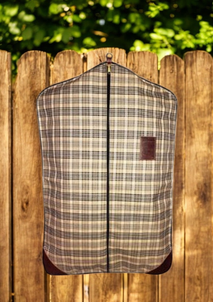 5/A Baker® Garment Carrier is made with Original Baker Plaid, and trimmed with the finest quality leather. Fully lined, beautifully finished, with just enough body to make it easy to load your clothing. Measures 25-1/2"W x 37-1/2"T. Baker 5/A bags come with the option to add a name or monogram. Because of the plaid pattern, we add a solid coordinating twill background (appliqué) with satin edging to make the lettering stand out appropriately. You may choose your font and we will do the rest!